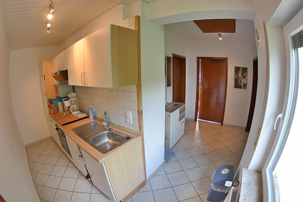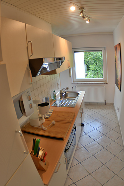 Die Küchenzeile ist ausgestattet mit einem Kühlschrank und Gefrierfach, Herd, Dunstabzugshaube, Ofen, Mikrowelle, Kaffeemaschine, Heißwasserkocher, Toaster und Töpfe/Pfannen sowie Essgeschirr, Tassen, Gläser, Besteck, Mixer, Messbecher, Siebe u.v.m